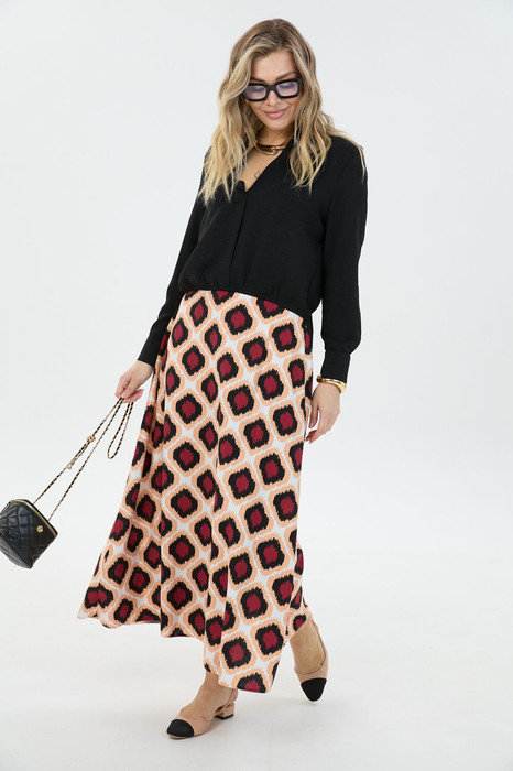 Комплект 2ка, состоящий из блузки и юбки. Блузка свободного силуэта с ассиметричным низом - спереди короче, сзади длиннее. Вырез горловины V-образный, воротник рубашечного типа. По низу переда блузки вставлена резинка. Манжеты с застёжкой на две пуговицы.  Юбка кроя трапеция, длины "макси". Пояс юбки по спинке на резинке, сбоку застёжка на потайную молнию и пуговицу.