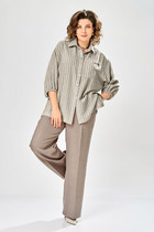 Комплект 2ка состоит из джемпера и брюк. Лёгкий джемпер свободного силуэта с короткими цельнокроеными рукавами и оригинальным кроем. Низ джемпера ассиметричный.Брюки из джинсовой ткани свободного объёма от бедра с застёжкой на молнию и пуговицу. По переду и сзади расположены карманы.