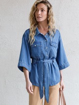 Комплект 2ка состоит из блузки и брюк. Блузка прямого силуэта свободного кроя из приятной к телу ткани с вискозной изнанкой и блестящей лицевой стороной. Спинка блузки удлинённая, горловина V-образная, на рукавах выполнены подвороты. Брюки из джинсовой ткани свободного объёма от бедра с застёжкой на молнию и пуговицу. По переду и сзади расположены карманы.