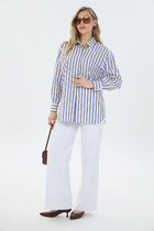 Комплект 2ка состоит из рубашки и брюк. Брюки из джинсовой ткани свободного объёма от бедра с застёжкой на молнию и пуговицу. По переду и сзади расположены карманы. Рубашка женская большого объема, прямого силуэта. На детали спинки расположена двойная кокетка, переходящая на деталь полочки. Под кокеткой на спинке встречная складка. Воротник рубашечный отложной на стойке. Застежка планка центральная на прорезные петли и пуговицы. Линия плеча спущенная, рукав рубашечный, длинный. В нижней части рукава заложены складки, заканчивается манжетой с двумя прорезными петлями и пуговицами. Низ блузки разноуровневый: спереди короче, сзади длиннее.
