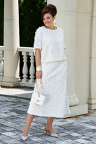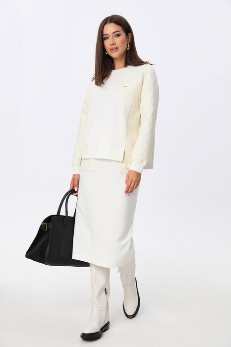 Трикотажный костюм 2ка , состоящий из джемпера и юбки. Джемпер прямого кроя свободного силуэта. Низ джемпера по переду укорочен и дополнен разрезами. Рукава джемпера, боковые вставки и карман на груди выполнены из мягкой стёганой отделочной ткани. Юбка-карандаш длиной ниже колена. По переду расположены карманы из стёганой ткани. Рост фотомодели 175 см. Размер у фотомодели – 44. Длина юбки в 44 размере 74 см ,длина джемпера по спинке 62 см.