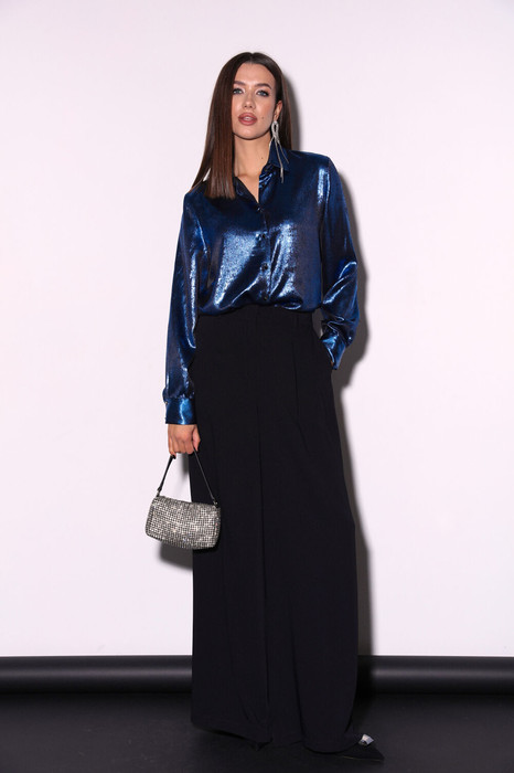 Комплект 2ка, состоящий из блузки и брюк. Блузка прямого силуэта из ткани с приятной к телу ткани с вискозной изнанкой и блестящей лицевой стороной. Воротник рубашечного типа, застежка на прорезные петли и пуговицы. В нижней части рукава заложены складки, манжета на двух пуговицах. Длина блузы по спинке 64-68 см. Брюки широкого объема, прямого силуэта. В боковых швах расположены карманы с наклонным входом. Застежка-гульфик. Пояс отрезной, притачной. В задней части пояса вставлена эластичная тесьма (резинка). Пояс застегивается на петлю и крючок.