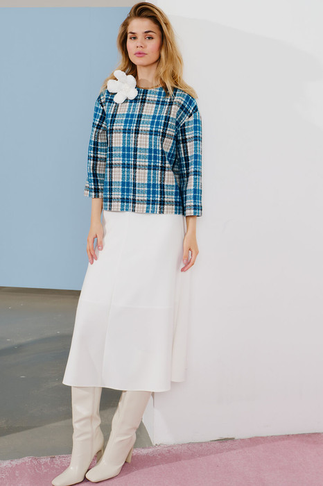 Костюм состоит из топа и юбки. Топ выполнен из текстильной ткани, дизайн клетка, на трикотажной подкладке. Линия плеча спущена, рукав укороченный 3/4. По переду округлый вырез горловины. По спинке застёжка на петли и пуговицы. Юбка А-силуэта на притачном поясе, на подкладке. По передней части юбки средний шов, по задней части юбки средний шов, переходящий в застёжку на потайную молнию. В комплектацию входит костюма входит брошь ручной работы.