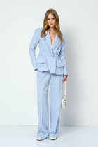 Жакет полуприлегающего силуэта с центральной застежкой на петли и пуговицы. Край борта фигурной формы. Рукав втачной длинный со шлицей. На шлице рукава пуговица. Воротник рубашечного кроя. По спинке средний шов и рельефы. Брюки свободного кроя, прямого силуэта, на притачном поясе. По переду глубокие складки, в боковых швах прорезные карманы. По задней половине брюк талевые вытачки. К комплекту прилагается съемный пояс коричневого цвета.