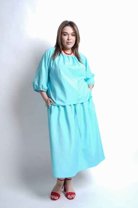 Летний костюм из льняной ткани, состоит из блузы и юбки. Блуза свободного силуэта длиной до линии бедер, с разноуровненным низом. Круглый вырез горловины со сборкой, обработанный окантовкой мягко подчеркивает обьем груди. Рукава покроя реглан, длиной 3/4 со сборкой по низу. Юбка силуэта трапеция, длина миди, без подклада. Пояс на широкой резине, дополнен декоративным шнуром. Стильный, удобный костюм отлично разнообразит ваш летний гардероб.