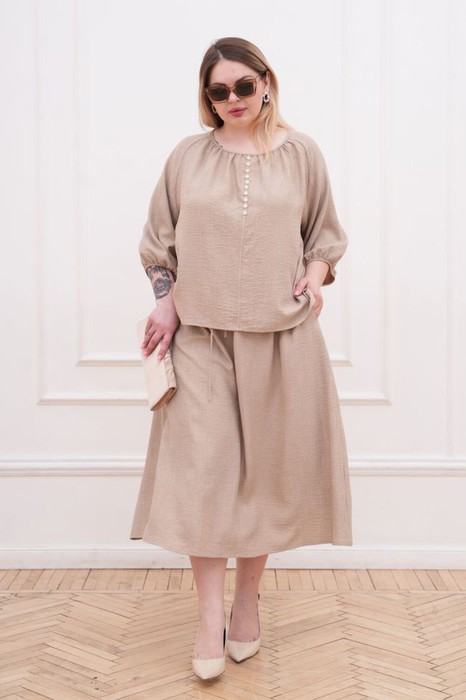 Летний костюм из льняной ткани, состоит из блузы и юбки. Блуза свободного силуэта длиной до линии бедер, с разноуровненным низом. Круглый вырез горловины со сборкой, обработанный окантовкой мягко подчеркивает обьем груди. Рукава покроя реглан, длиной 3/4 со сборкой по низу. Юбка силуэта трапеция, длина миди, без подклада. Пояс на широкой резине, дополнен декоративным шнуром. Стильный, удобный костюм отлично разнообразит ваш летний гардероб.