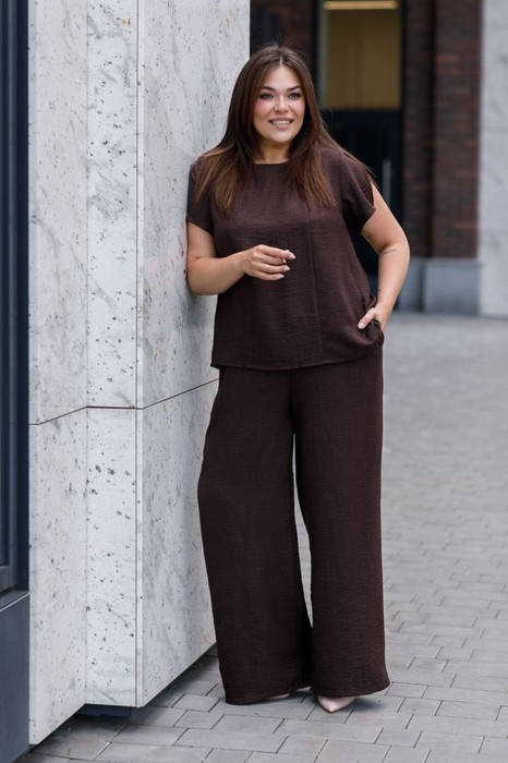 Летний костюм из льняной ткани, состоит из блузы и брюк. Блуза прямого силуэта длиной до линии бедер. Вырез горловины круглый, обработан обтачкой. Рукава втачные, длиной до линии логтя с разрезом по середине рукава. Брюки прямого силуэта. Модель с высокой посадкой на талии. Верх оформлен широким поясом на резинке. Стильный и комфортный вариант для лета.