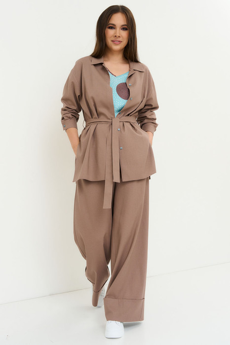 Стильный и комфортный льняной комплект из блузы, топа и брюк.  Льняная блуза рубашечного кроя с отложным воротником и центральной застежкой на пришивные пуговицы. Рукав длинный , спущен, с притачной манжетой.  Топ прямого кроя с цельнокроеным  коротким рукавом.  Широкие льняные брюки свободного прямого кроя , с притачным поясом, дополненным эластичной тесьмой. По бокам расположены удобные карманы. По низу брюки с широким подворотом. Застежка на молнию и пришивную пуговицу. Длина блузы от плечевого шва 77 см. Длина рукава 60см. Длина топа от плечевого шва 60 см. Длина брюк по боковому шву 106 см.