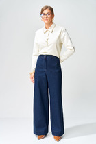 Стильный и комфортный комплект из блузы, футболки и брюк. Блуза рубашечного кроя с отложным воротником и центральной застежкой на пришивные пуговицы. Рукав длинный, спущен, с притачной манжетой. Дополнена пришивной аппликацией (дизайн аппликации может отличаться от фото в зависимости от партии) Футболка прямого кроя с втачным коротким рукавом. Горловина V-образная. Выполнена из поливискозной ткани с легким атласным блеском. Свободные брюки прямого кроя с притачным поясом, дополненным эластичной тесьмой. По бокам расположены удобные карманы. По низу брюки с широким подворотом с отделкой из салатовой тесьмы. Застежка на молнию и пришивную пуговицу. Длина блузы от плечевого шва 77 см. Длина рукава 60 см. Длина топа от плечевого шва 60 см. Длина брюк по боковому шву 107 см.