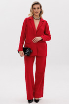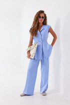 Стильный компект из жакета и брюк. Двубортный жакет выполнен из костюмной ткани в комбинации с темно-синим джинсом. Жакет на подкладке с застежкой на пришивные пуговицы. Рукав втачной, дополнен манжетой из джинса. Воротник отложной. Брюки классического прямого кроя с притачным поясом, выполненным из джинса, дополненным эластичной тесьмой. Посадка средняя. Дополнены удобными боковыми карманами. Застежка гульфик на молнию и пришивную пуговицу. Брюки выполнены из комфортной костюмной ткани. Длина жакета от плечевого шва 58см. Длина рукава 60см. Длина брюк по боковому шву 104см.