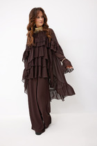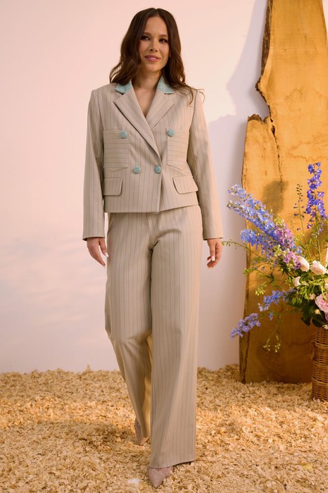 Стильный комплект из жакета и брюк. Жакет двубортный прямого кроя, на подкладке, слегка укорочен. Классический воротник и застежка на пуговицы создают стильный и универсальный силуэт, который легко комбинируется как с брюками прямого кроя , так и с юбкой. Рукав втачной. Жакет дополнен отделкой из рогожки бирюзового цвета, что придает образу уникальность. Брюки прямого кроя с притачным поясом, дополненным эластичной тесьмой. Посадка средняя. Застежка гульфик на молнию и пуговицу. Дополнены функциональными боковыми карманами. Длина жакета от плечевого шва 57см. Длина рукава 60см. Длина брюк по боковому шву 104см.