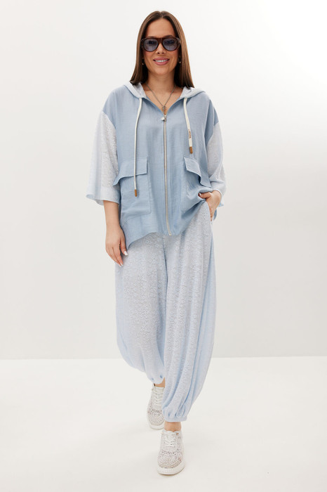 Стильный летний комплект из блузы и брюк, выполненный из ажурного трикотажного полотна в сочетании с  легкой однотонной тканью. Блуза свободного кроя с центральной застежкой на молнию. Горловина обработана капюшоном. Блуза с удлиненной спинкой.  Легкие и дышащие брюки-алладины свободного объемного кроя выполнены из ажурного трикотажного полотна. Дополнены притачным поясом с эластичной тесьмой.  Удобные боковые карманы придают еще большего комфорта. Брюки имеют подкладку-шортики телесного цвета.  Длина блузы по переду 70см, по спинке 86см. Длина рукава 35см. Длина брюк по боковому шву 96см.