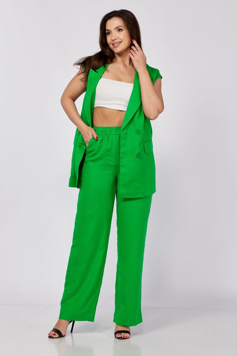 Костюм льняной 2-х предметный от MALI, состоящий из жилета и брюк. Жилет прямого силуэта без подклажки, на центральной двубортной застежке на петли и пуговицы. Перед с талиевыми вытачками и прорезными карманами "в рамку" с клапанами. Спинка со средним швом, внизу которого шлица. Воротник стояче-отложной с лацканами. Жилет удлиненный, в комплекте идет съемный пояс из основной ткани. Брюки прямые, Брюки прямые. С карманом с отрезным бочком. Пояс на резинке и декоративным гульфиком без кулисы.