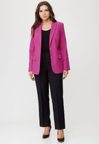 Универсальный и удобный женский брючный костюм из мягкой костюмной ткани предназначен для повседневной носки и торжественных мероприятий. Жакет укороченный с цельнокроенным рукавом длиной 7/8 с патой, закрепленной пуговицей. Перед жакета с ассиметричной косой застежкой на навесные петли с пуговицами. В качестве декора горловина и край борта передних полочек отделан вставкой из экокожи в цвет основной ткани. Брюки-шаровары длиной 7/8, по верху с поясом на резинке. Имеются боковые карманы в швах. Также по талии( переда) двухвстречные складки, по низу передних и задних половинок односторонние складки, придающие пышность брюкам. Комплект смело сочетается с любой обувью. Длина жакета по спинке 56 см+-1 см, длина рукава от горловины 50 см ± 1см. Длина брюк по боковому шву 99 см+-1см, по шаговому 66 см+-1см. Изделие подойдет на рост 170 см.