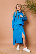 Костюм женский, брючный, спортивного типа из однотонного трикотажа «футер-трехнитка»— это удобная и стильная одежда на каждый день. Худи с капюшоном, покроя реглан, длинный рукав на манжете. Перед с центральной застежкой на молнию и карманом кенгуру, спинка цельная, низ худи с притачной планкой. По переду декор в виде настрочной декоративной тесьмы- лампаса от центра полочки с переходом на рукав вдоль манжеты. Внутренная часть капюшона выполнена из контрасной ткани. Брюки длинные, клеш, на притачном поясе с резинкой, по переду брюк имеются два кармана в боковых  швах. Длина худи по спинке 64+-1см, длина рукава от горловины 72+-1см.  Длина брюк по боковому шву 111+-1см длина брюк пошаговому шву 80± 1см. Изделие подойдет на рост 170 см.