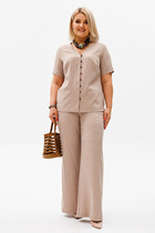 Универсальный и удобный женский й костюм  выполнен из двух предметов: жакета и брюк. Жакет из натуральной ткани,  свободного силуэта, с цельнокроенным коротким рукавом с манжетой.  Перед жакета с прямой застежкой  на навесные петли с пуговицами. Брюки-шаровары выполнены из струящейся ткани,  длиной 7/8, по верху с поясом на резинке, имеются боковые карманы в швах. Комплект смело сочетается с любой обувью, будет назаменим для будней и любых торжественных мероприятий. Длина жакета по спинке 55 см+-1 см, длина рукава от горловины 41 см ± 1см. Длина брюк по боковому шву 99 см+-1см, по шаговому 66 см+-1см. Изделие подойдет на рост 170 см.