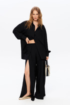 Костюм-тройка - это стильный и элегантный вариант женского делового костюма, состоящего из жилета, брюк и топа. Этот классический ансамбль придает образу серьезность и профессионализм, сохраняя при этом женственность и изысканность обладательницы. Костюм женский, брючный, выполнен из струящейся легкой вискозной ткани, состоит из распашного удлиненного жилета, свободных прямых длинных брюк и однотонного топа. Жилет прямого силуэта со съемным поясом с застежкой на полукольца, с пиджачным воротником с лацканами. Перед распашной с бортами встык, с двумя прорезными карманами с листочками. Спинка цельная. Плечо спущенное, по плечевым швам вставки из декоративной сетки. Брюки прямые, расширенные к низу, длинные, по низу с широкой подгибкой, по верху - на притачном поясе с резинкой. Топ без рукавов с квадратной горловиной по переду и рельефами. Спинка с центральным швом. Пройма и горловина спинки окантованы. Длина жакета по спинке73 см(+-1 см), длина рукава 27 см(+-1см), длина брюк по боковому шву 112 см(+-1 см), длина брюк по шаговому шву 82 см(+-1 см). Длина топа по спинке 55 см(+-1см)