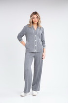 Комплект состоит из удлиненной туники и брюк. Туника из мягкого теплого трикотажного полотна со швом по переду и удлиненым разрезом. Линия плеча спушенна, рукав одношовный, воротник стойка. Брюки прямые от линии калена, застежкой в боковом шве на потайную молнию. Длина туники 115 см, длина рукава от плеча 66 см. длина брюк 108 см