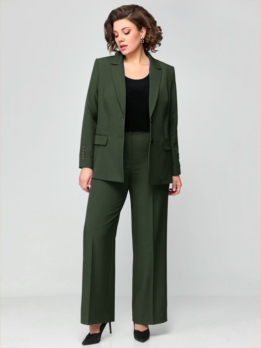 Комплект двухпредметный состоит из жакета и брюк. Жакет на подкладке с центральной застежкой на 2 петли и пуговицы с воротником пиджачного типа. По переду функциональными карманами с клапаном. Спинка с рельефом выходящим из проймы и средним швом. Рукав втачной с декоративным швом по середине рукава переходящим в шлицу. Шлица декорирована 5-ю пуговицами. Брюки прямые от бедра с боковыми карманами. Пояс на резинке по спинке. Костюм двойка отлично подойдет для офиса, для праздника, на каждый день для прогулок.