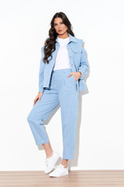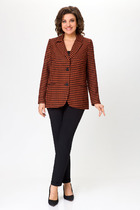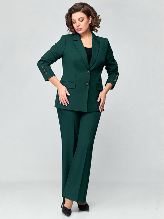 Комплект двухпредметный состоит из жакета и брюк. Жакет на подкладке с центральной застежкой на 2 петли и пуговицы с воротником пиджачного типа. По переду функциональными карманами с клапаном. Спинка с рельефом выходящим из проймы и средним швом. Рукав втачной с декоративным швом по середине рукава переходящим в шлицу. Шлица декорирована 5-ю пуговицами. Брюки прямые от бедра с боковыми карманами. Пояс на резинке по спинке. Костюм двойка отлично подойдет для офиса, для праздника, на каждый день для прогулок.