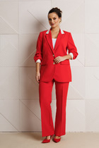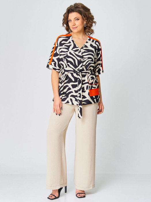 Летняя, стильная двойка. Именно этот комплект вам нужен. Комплект состоит из блузки и брюк. Блузка прямого силуэта выполнена из вискозной ткани. С контрастной оранжевой отделкой лампас по плечевому срезу и рукаву, клапану и мешковине кармана. Спущенная линя плеча, рукав короткий с отложной манжетой. По левой полочке заложена складка и имитация кармана.  Спинка со средним швом. По бокам имеются разрезы. Застёжка центральная на 5 пуговиц и петель. Брюки прямого силуэта, на притачном поясе с резинкой, по бокам расположены наклонные карманы. По брюкам прострочены контрастные отделочные строчки.