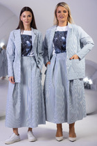 Комплект женский , двух предметный  состоящий из туники  и брюки. Туника прямого силуэта выполнена из трикотажного полотна « в полоску» . Горловина переда обработана  обтачкой.  Линия плеча спущена . По переду  авторская термопечать. Рукав втачной, двухошовный,  по переднему шву рукава сборка. По низу изделия и рукава приточная манжета.  Длина изделия по спинке- 63 см,  длина рукава от горловины –   64 см. Брюки  прямого силуэта на притачном поясе, с застежкой на тесьму- молнию и  1 пуговицу и петлю,  с боковыми наклонными карманами на передних половинках брюк . По передним  и задним половинкам  брюк заутюжен кант. Для лучшего прилегания брюк в области талии в поясе по бокам вставлена резинка. Длина  брюк   по боковому шву без пояса- 102 см.