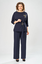 Костюм женский, состоит из блузы и брюк. Блуза прямого свободного силуэта из хлопка, рукав 3/4. Низ рукава собран на резинку-венгерку, и образует красивый волан. По бокам блузы разрезы. По верху блузы притачная планка, собранная на резинку-венгерку, на спинке планка завязывается на бант. Брюки на резинке, свободные, прямые, с карманами в боковых швах.