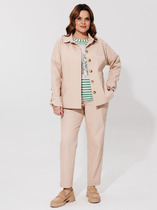 Комплект женский, из разных по фактуре тканей, состоящий из джемпера на трикотажной подкладке и брюк палаццо. Джемпер прямого силуэта, рукав втачной, одношовный. Горловина, низ рукава и низ изделия обработанны притачной трикотажной бейкой. Брюки палаццо, на притачном поясе с резинкой и тесьмой. У брюк - боковые карманы.