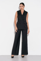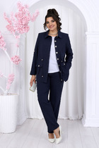 Костюм женский, состоит из блузы и брюк. Рукав у блузы - реглан, со сбокой по окату. Рукав расширенный до линии локтя. По переду и спинке блузы - притачная планка с резинкой. Низ блузы с притачным поясом и резинкой. Брюки на резинке, свободные, прямые, с карманами в боковых швах.