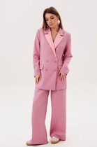 Костюм брючный, состоит из жакета и брюк. Жакет полуприлегающего силуэта, на подкладке, с центральной бортовой застежкой на 2 петли и пуговицы. Воротник отложной, на стойке. Рукав втачной, двухшовный со шлицей по низу и обработан 4-мя декоративными пуговицами. Карманы прорезные с клапаном. Спинка со средним швом. Брюки зауженные к колену, расклешенные к низу. Пояс притачной, застежка на молнию. Брюки с боковыми карманами.