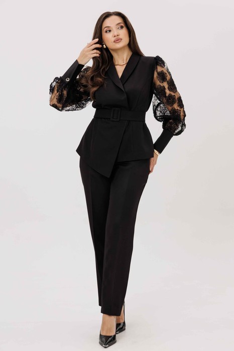 Женский брючный костюм, состоящий из жакета и брюк. Жакет полуприлегающего силуэта, двубортный, с застежкой на две пуговицы. Воротник английский. Рукав втачной, из кружевной ткани, заканчивается манжетой на пуговице. По бокам рельефные швы, формирующие силуэт. На уровне груди предусмотрены нагрудные вытачки. Брюки прямого силуэта, слегка зауженные к низу. Пояс частично на резинке (по бокам), с шлевками для ремня. Застежка на гульфик с молнией и внутренним крючком. По бокам боковые карманы с косым входом. Материал костюма костюмный, средней плотности, с гладкой фактурой. Без подкладки. Дополняет модель широкий пояс.