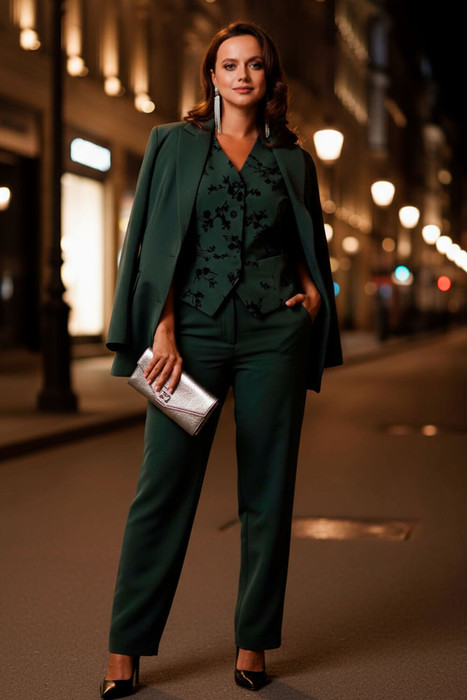 Элегантный женский костюм, состоящий из жакета и прямых брюк, выполнен из костюмной ткани с флоковым напылением — материал стабилизирован, не растягивается и отлично держит форму. Жакет однобортный, на петлях и пуговицах, с английским воротником и клапанами по бокам. Рукав втачной, длина — полная. Посадка свободная, что обеспечивает комфорт и стильный силуэт. Жилет женский из костюмной ткани с флоковым напылением по полочкам и однотонной спинкой без флока. Модель выполнена на подкладке, что обеспечивает идеальную посадку и комфорт при носке. Фасон приталенный, с V-образным вырезом и застёжкой на петли и пуговицы. По линии талии — декоративный хлястик по спинке, подчёркивающий фигуру. Полочки оформлены листочками имитации карманов, низ жилета — с фигурным вырезом по центру, визуально вытягивающим силуэт. Брюки прямого кроя, на частичной резинке по поясу для удобной посадки и идеального прилегания.