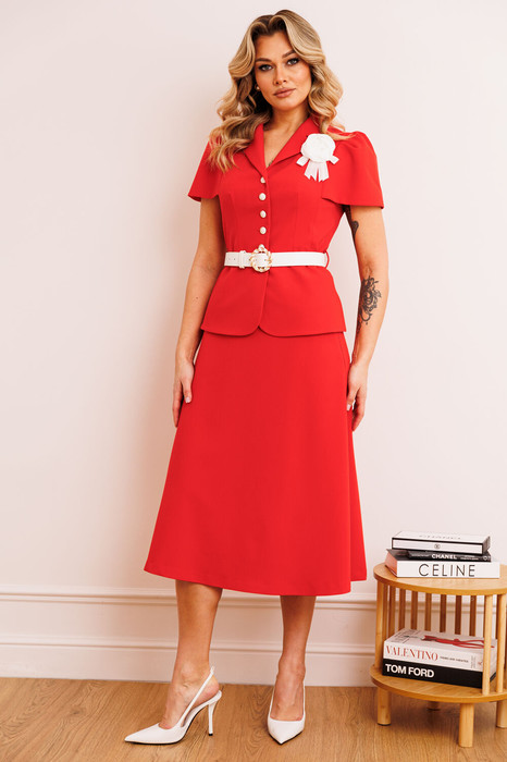 Двухпредметный комплект, состоящий из жакета и юбки. Жакет полуприлегающего силуэта, отрезной по линии талии. Перед и спинка с вертикальными рельефами, в которые вставлены рукава, сверху по окату со складками. Спинка со средним швом. Воротник пиджачного типа. Застежка на петли-пуговицы. Юбка А-силуэта, на притачном поясе, по бокам с резинками. Застежка на тесьму-молнию в среднем шве, который переходит в шлицу. Костюм на подкладке. Комплект декорирован съемной брошью в виде цветка.