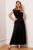Изысканный двухпредметный костюм, состоящий из жакета полуприлегающего силуэта и женственного платья. Модель выполнена из мягкого костюмного полотна, которое дарит ощущение комфорта в течение всего дня.Жакет отличается продуманным кроем: фигурные рельефы, выходящие из пройм в боковые швы, моделируют силуэт. Центральная застежка на петлю и пуговицу дополнена закругленными бортами. Главный акцент — фантазийный вырез горловины с цельнокроеной стойкой по переду, элегантно зафиксированной стильными зажимами. Рукава — втачные, двухшовные, со шлицами на пуговицах. Жакет полностью на подкладке.Платье приталенного силуэта длиной ниже колена подчеркивает достоинства фигуры. Вырез «лодочкой» спереди и V-образный вырез на спинке открывают плечи. Короткие рукава-«крылышки» придают образу легкость. Для комфорта движений в среднем шве спинки предусмотрены шлица и потайная молния. Платье также посажено на подкладку.