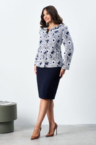 Платье полуприлегающего силуэта, спереди со шлицей. Спинка со средним швом и талиевыми вытачками. Застежка на тесьму молнию в среднем шве. Костюм на подкладке. Главным акцентом является съемная брошь, декорированная бусинками и перьями.