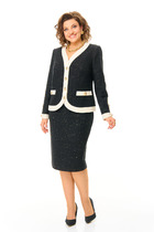 Жакет прямого кроя на подкладке. По переду нагрудные вытачки, функциональные карманы с листочкой, центральная двубортная застежка на петли-пуговицы. Горловина оформлена воротником пиджачного типа с лацканом. Спинка со средним швом, шлицей-планкой из отделочной ткани, застегивающейся на петли-пуговицы. Рукава втачные, двухшовные. Жакет декорирван съемным цветком из отделочной ткани.