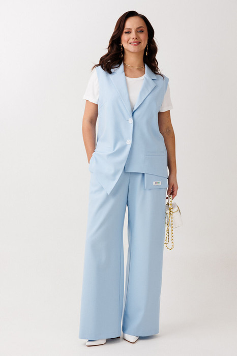 Стильный женский костюм, состоящий из жилета, брюк и блузы.