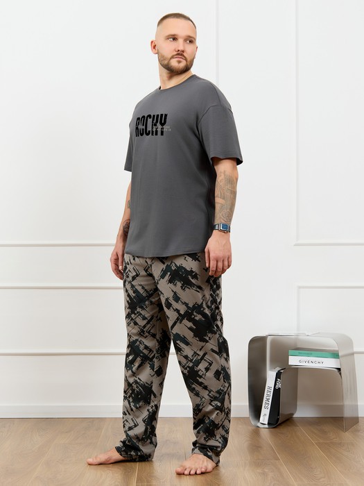 Костюм мужской, состоящий из футболки и брюк. Футболка однотонная с принтом на груди; модель свободная, со спущенной линией плеч, овальным вырезом горловины. Брюки из полотна с набивным рисунком эксклюзивного дизайна, прямые, с боковыми карманами с обтачными входами, на притачном поясе с отстроченной эластичной тесьмой.