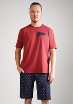 Костюм мужской, состоящий из футболки и брюк. Футболка однотонная с принтом на груди; модель свободная, со спущенной линией плеч. Брюки из полотна с набивным рисунком в узкую черно-белую полоску, прямые, с боковыми карманами с обтачными входами, на притачном поясе с отстроченной эластичной тесьмой.
