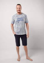 Костюм мужской, состоящий из футболки и шорт. Футболка однотонная с принтом на груди; модель свободная, со спущенной линией плеч, втачными рукавами, овальным вырезом горловины. Шорты из полотна с набивным рисунком эксклюзивного дизайна, с боковыми карманами с обтачными входами, на притачном поясе с отстроченной эластичной тесьмой.