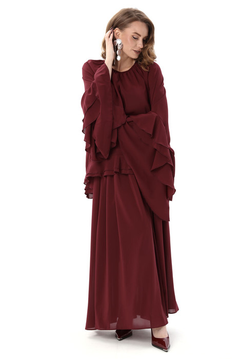 Костюм трехпредметный: состоит из блузы, юбки и комбинации. Блуза свободного силуэта с присборенной горловиной, обработанной бейкой. Спинка со средним швом, переходящим в разрез. Рукава реглан с асимметричными воланами. Юбка макси расширенного силуэта на резинке. Нижний край блузы с двойным воланом. Нижнее платье комбинация на регулируемых бретелях.