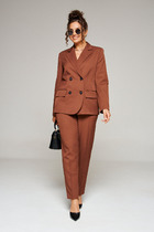 Костюм двухпредметный: состоит из кардигана и юбки. Кардиган свободного прямого силуэта длиной макси. Изделие со съемным поясом  и накладными карманами. Рукав втачной, двухшовный, пройма приспущена. Воротник английский. Застежка не предусмотрена. В боковых швах разрезы. Юбка - солнце макси с узким поясом. В боковых швах расположены карманы. Застёжка на петлю и пуговицу и молнию по спинке.