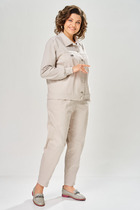 Костюм трехпредметный: состоит из джемпера, брюк и топа. Джемпер прямого силуэта на подкладке. Рукав втачной. По переду карманы, застёжка на тесьму-молнию. Воротник прилегающий. Длина рукава 60 см, длина изделия 56 см. Топ на тонких регулируемых бретелях. Брюки-юбка свободного кроя из трикотажного гофре, верхний срез представлен широкой резинкой.