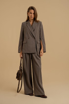 Костюм двухпредметный: состоит из джемпера и платья. Элегантный укороченный джемпер-кейп прямого свободного силуэта с округлой горловиной и фигурным лифом. Рукав втачной широкий, от линии локтя до запястья есть дополнительное отверстие для рук. Платье прямого силуэта, с небольшим расширением к низу, длиной макси. Перед с нагрудной вытачкой из бокового шва. Вырез горловины переда и спинки имеют V-образную форму.