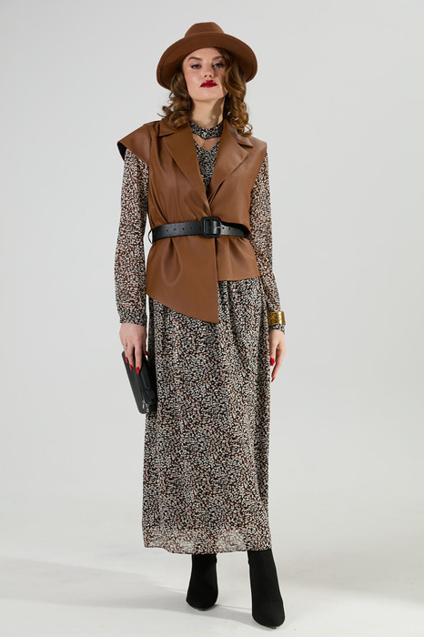 Костюм двухпредметный: состоит из платья и жилета. Платье макси прямого силуэта с V-образным вырезом, отрезное по линии талии. Горловине с имитацией чокера, застёжка на петлю и декоративную пуговицу. Рукав немного приспущен, по низу собран на манжет с петлей и пуговицей. Изделие на подкладке. Жилет из экокожи прямого силуэта с воротником пиджачного типа. По правой пройме переда расположена фигурная  деталь  "крылышко". Спинка со средним швом. По низу правого переда и низу правой спинки фигурная деталь. По левой части переда и левой части спинки отлетная кокетка. Изделие идёт в комплекте с ремнем из экокожи.