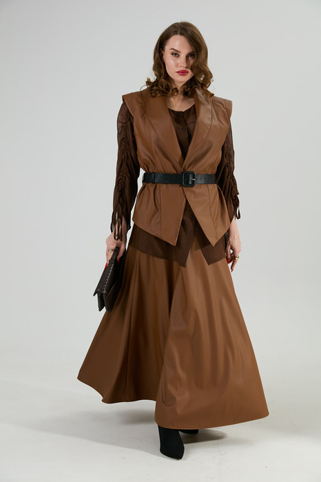 Костюм трехпредметный: состоит из блузы, юбки и жилета. Блуза прямого кроя с центральной застёжкой на петли и пуговицы. Вырез горловины глубокий округлый. Линия плеча приспущена. На рукавах изделия заложена декоративная сборка с регулируемыми завязками (кулиса). Жилет удлиненный свободного прямого силуэта, воротник пиджачного типа. Линия низа по переду и спинке фигурная ассиметричная. Короткий рукав-крылышко. Талия фиксируется съемным ремнем из экокожи, для которого в боковых швах оформлены шлевки. Ремень идёт в комплекте к изделию. Юбка - солнце с узким поясом. В боковых швах расположены карманы. Застёжка на петлю и пуговицу и молнию по спинке.