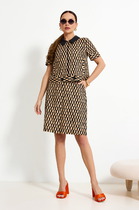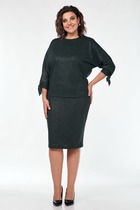 Костюм двухпредметный из облегченного денима: состоит из рубашки и юбки. Укороченная рубашка прямого кроя со спущенной линией плеча. Горловина обработана рубашечным воротником с отрезной стойкой. Застёжка центральная на кнопки. Спереди есть нагрудные карманы. Низ рукава обработан притачной манжетой, застёгивается на кнопки. Юбка длиной миди, расклешенная к низу, с асимметричным низом. Пояс притачной, по спинке собран на резинку. Переднее полотнище состоит из трех частей. Правая часть скреплена отделочной строчкой и кнопками. В боковых швах изделия расположены карманы. По спинке изделия идёт средний шов и две вытачки для удачной посадки по фигуре. Юбка без подкладки.