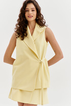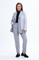 Костюм двухпредметный: состоит из джемпера и брюк. Джемпер свободного силуэта с округлой горловиной. Рукав комбинированного кроя, с передними и задними швами. Верхняя и нижняя часть рукава образуют между собой разрез. Карманы в боковых швах. По переду изделие декорировано фигурным бантом. Брюки со стрелкой свободного кроя, верхний срез представлен широкой резинкой, с карманами.