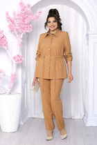 Костюм двухпредметный: состоит из джемпера и брюк. Джемпер из комбинированной ткани свободного силуэта. Рукав реглан. Воротник стойка. Брюки со стрелкой свободного кроя, верхний срез представлен широкой резинкой, с карманами.