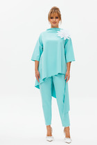 Костюм двухпредметный: состоит из рубашки и юбки. Рубашка прямого кроя со спущенной линией плеча. Горловина обработана рубашечным воротником с отрезной стойкой. Застёжка центральная на кнопки. Есть нагрудные карманы и в боковых швах. Низ рукава обработан притачной манжетой, застёгивается на кнопки. Фигурный низ. Изделие без подкладки. Элегантная юбка прямого силуэта длиной миди с разрезами на переднем и заднем полотнищах. Переднее полотнище с частичным запахом, имитацией боковых карманов с отрезным бочком. Заднее полотнище со средним швом, отрезной кокеткой, накладными карманами. Пояс притачной.
